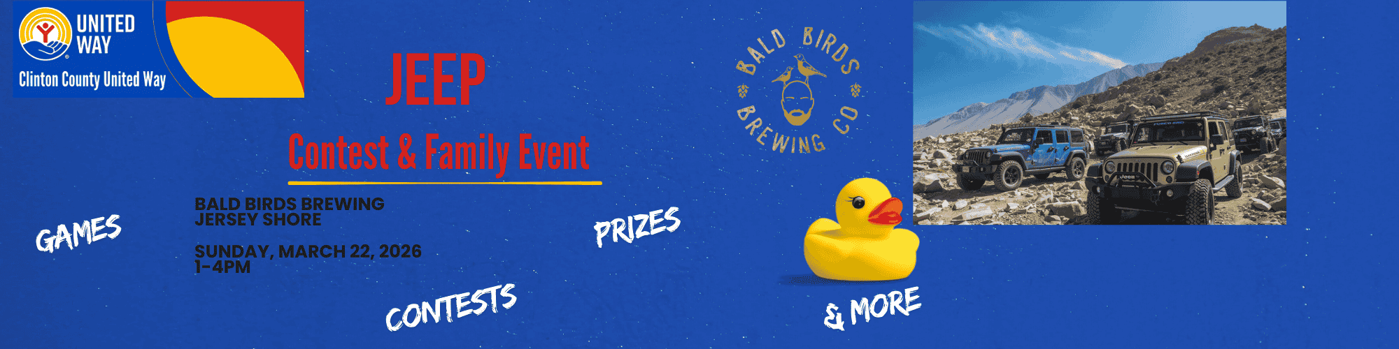 Get ready for a fun afternoon for the entire family! We will have JEEP contests, kids games, adult games & MORE! Support the Clinton County United Way with custom ducks, and join us for a fun afternoon outing for the entire family.
